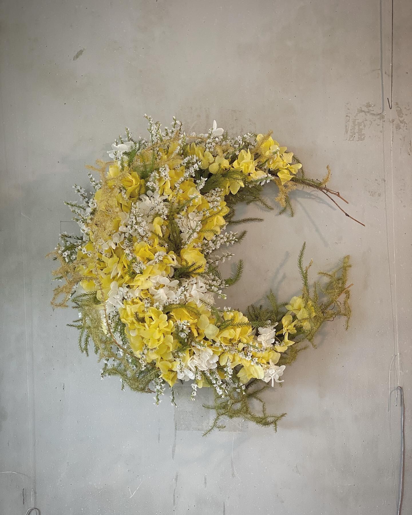 三日月型のリースが、インテリアに華やかな存在感を与えます。
