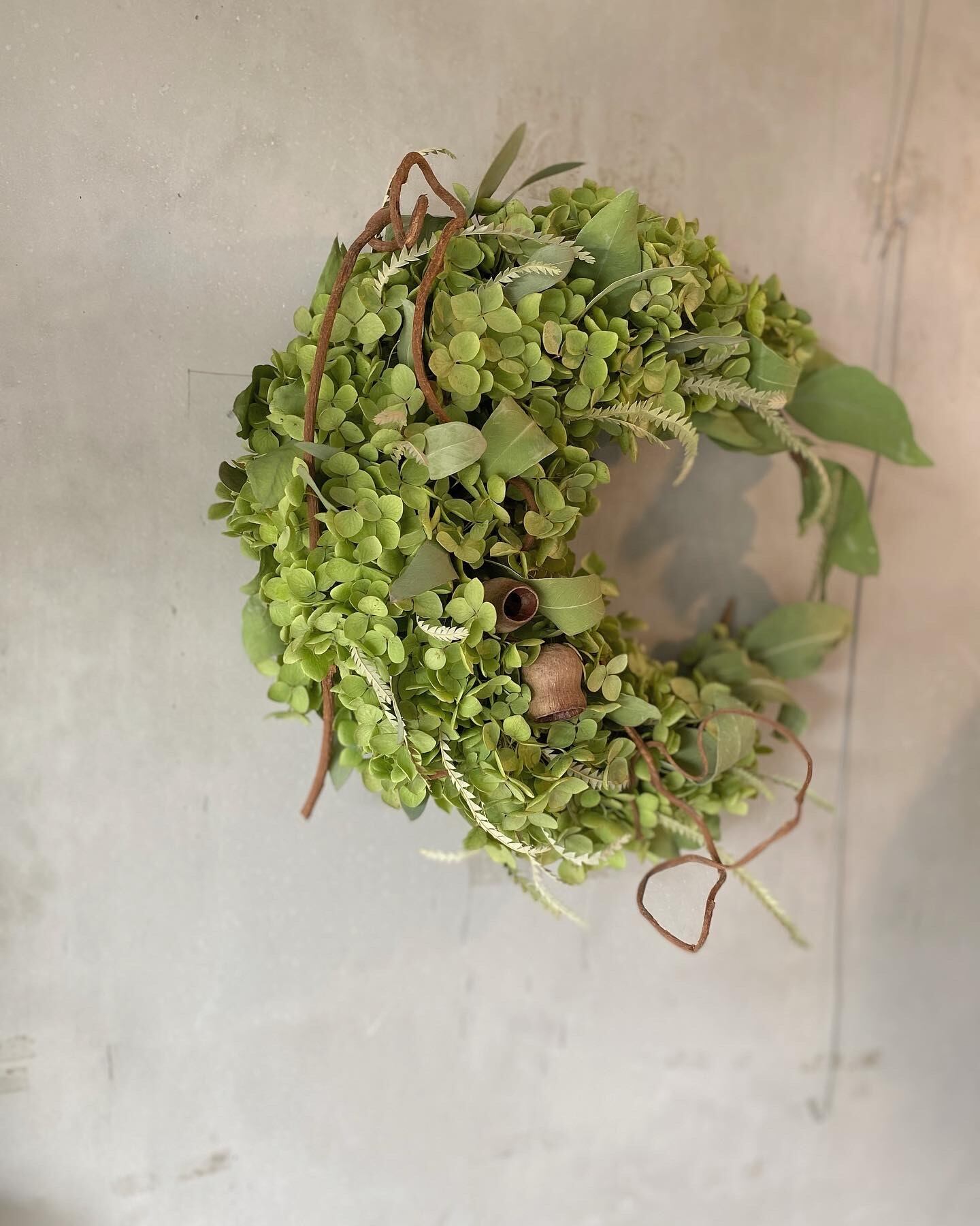 大人気のお花、グリーンアナベルのクレッセントリースです。月のような形をしたこのリースは、ドライフラワーなので長い間飾っていただけます。